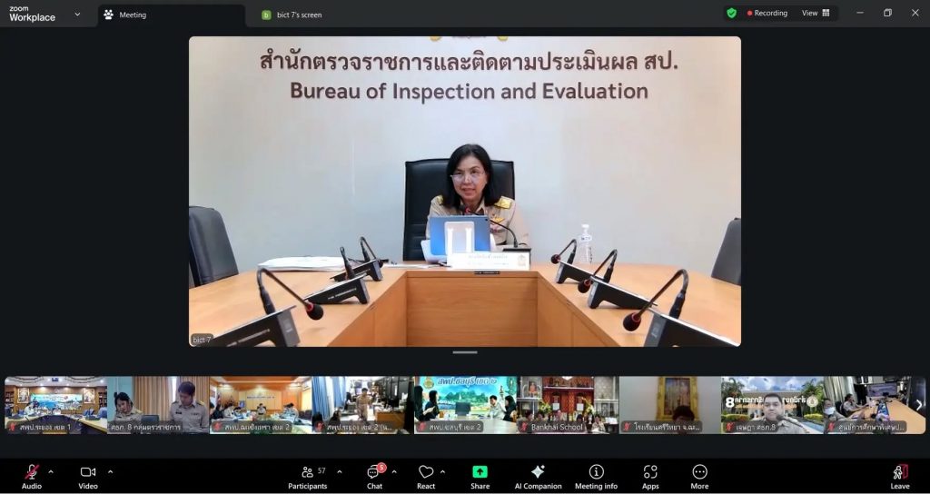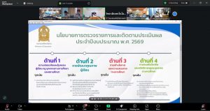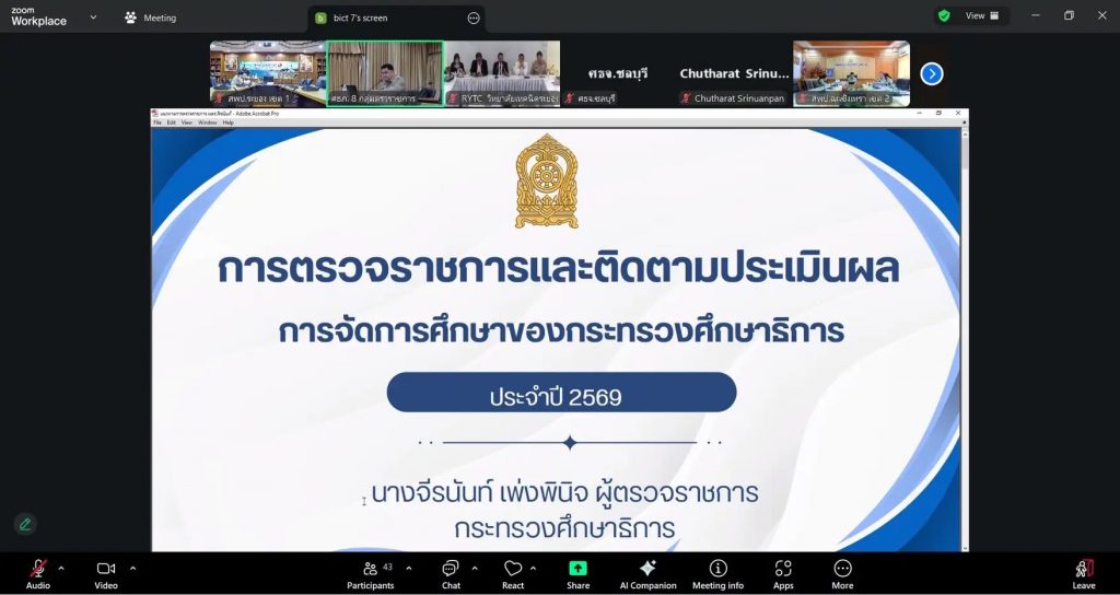 และนางบงกช อาจองค์ ผู้อำนวยการกลุ่มนโยบายและแผน รวมทั้งบุคลากรกลุ่มนโยบายและแผน เข้าร่วมการประชุมการตรวจราชการและติดตามประเมินผลการจัดการศึกษาของกระทรวงศึกษาธิการ กรณีปกติ รอบที่ 1 ประจำปีงบประมาณ พ.ศ. 2569 เขตตรวจราชการที่ 8 (จังหวัดชลบุรี จังหวัดฉะเชิงเทรา และจังหวัดระยอง) ผ่านระบบประชุมทางไกลออนไลน์ (ZOOM Meeting)